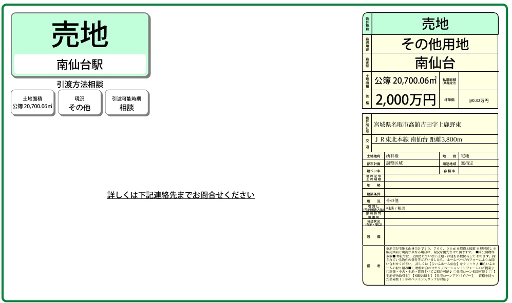2025年10月26日 【新着物件情報!】名取市高舘吉田字上鹿野東 広々した土地♪売却依頼いただきました☆彡 【売却依頼】 ・名取市高舘吉田字上鹿野東 ・土地 2000万円 新規売却依頼いただきました! ※価格は2025年10月26日現在の価格です。 土地面積:20700.06㎡ 🌳広々とした土地! ⛺キャンプ用地などにいかがでしょうか?☺ 📞気になる物件がございましたら、ぜひお問い合わせください! 賃貸アパート・マンション、不動産情報検索サイト – ハトマークサイト tag: ウリチョクライフワーク仙台不動産売却仙台不動産売却はらいふホーム仙台市不動産売却売却依頼愛子不動産売却はらいふホーム
